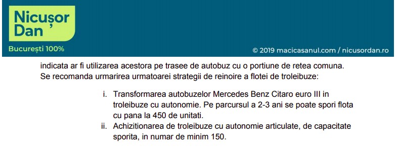Înainte de a fi ales edil al Capitalei, Nicușor Dan promitea pe lângă cele 100 de troleibuze ce urmau să sosească la București, în baza licitației lansate de fosta administrație în februarie 2019, cel puțin încă 150 de troleibuze articulate, precum și transformarea de autobuze Mercedes Benz Citaro Euro 3 în troleibuze cu autonomie (foto jos).