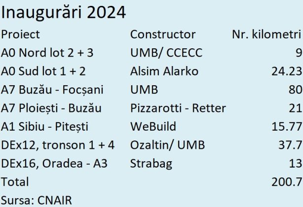 200 de kilometri inaugurați în 2024Anul acesta au fost dați în circulație, până în prezent, aproape 144 de kilometri de autostradă şi drum expres. Până la finele anului vor mai fi inaugurați încă 57 kilometri.