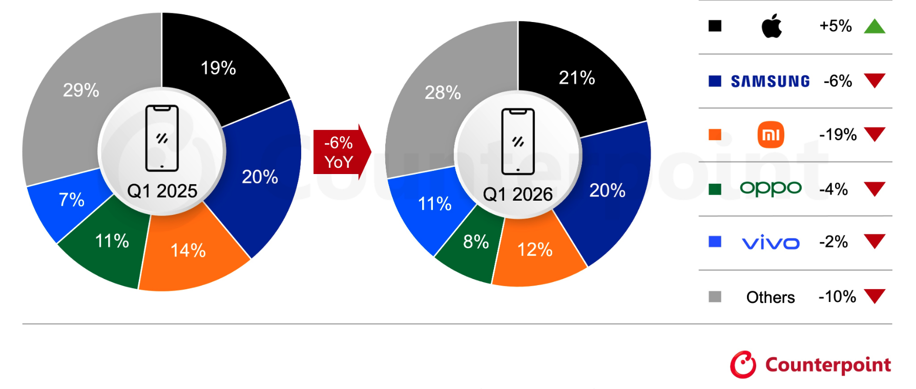 În schimb, Samsung a înregistrat o scădere de 6% a livrărilor și a coborât pe locul al doilea, cu o cotă de piață de 20%. Rezultatul a fost influențat de amânarea lansării seriei Galaxy S26 și de cererea mai slabă din segmentul telefoanelor accesibile.