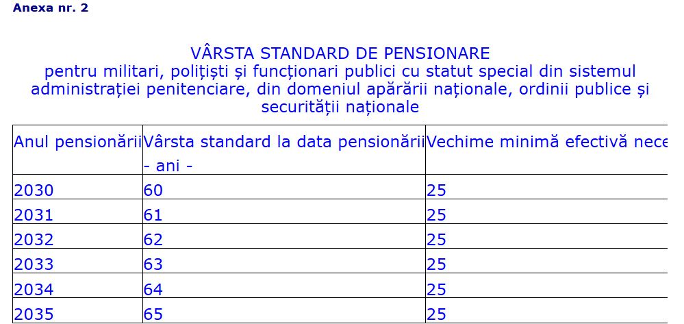 Vârsta standard de pensionare pentru limită de vârstă este de 65 de ani. Atingerea acestei vârste se realizează prin creșterea vârstelor standard de pensionare conform eșalonărilor prevăzute în anexele nr. 1 și 2 la Legea 223 din 2015.