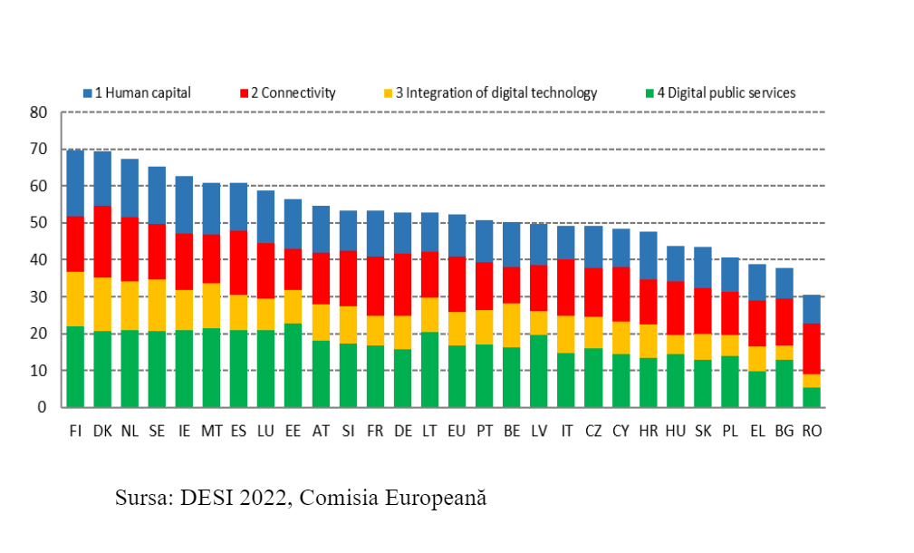Tot în anul 2022, conform Comisiei Europene, România se evidenția ca fiind cea mai puțin digitalizată țară din Uniunea Europeană, cu un procent de 5,8% pentru serviciile publice oferite. În contrast, state precum Finlanda se distingeau printr-un procent semnificativ mai mare, de 21,8%.