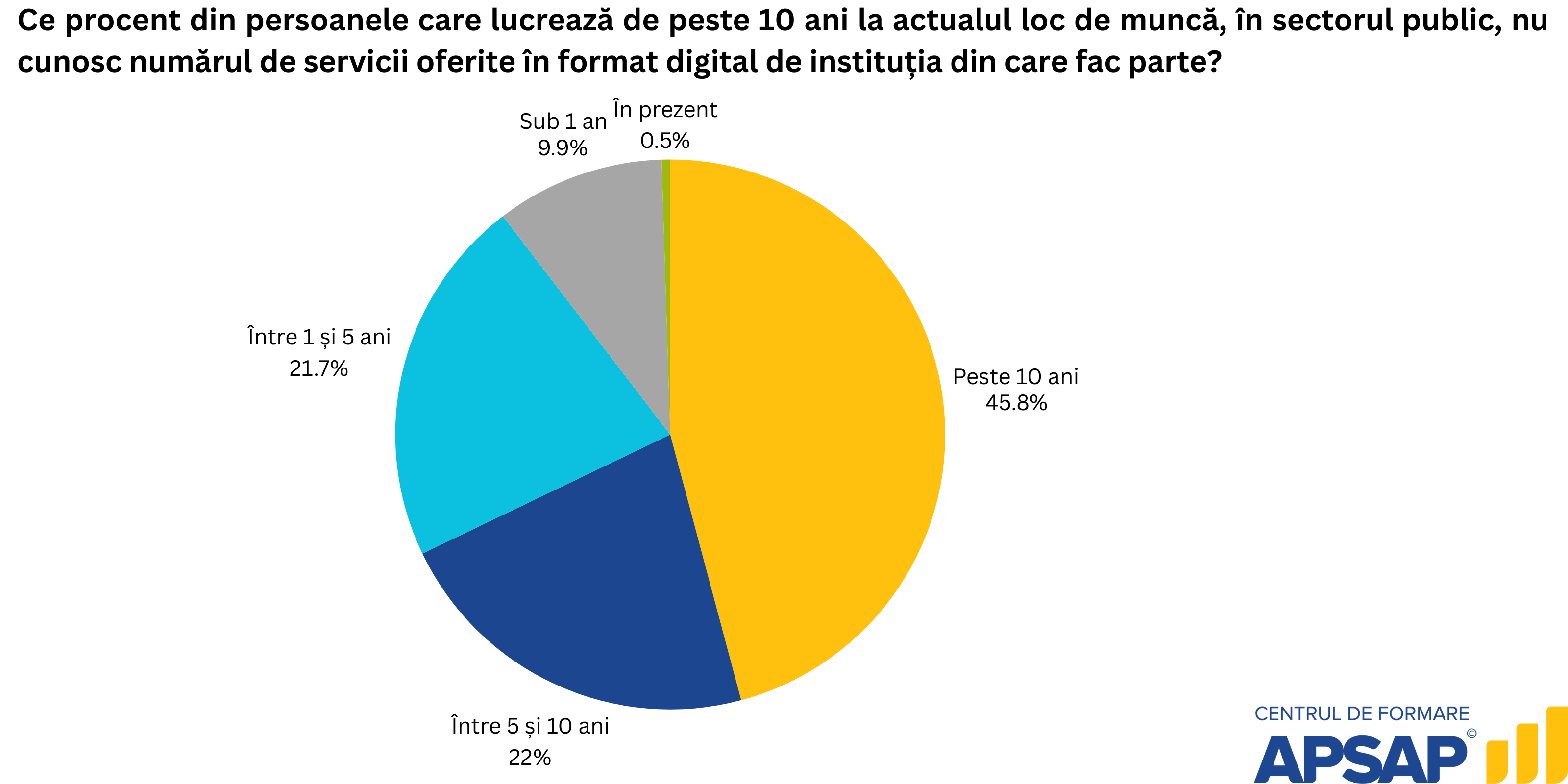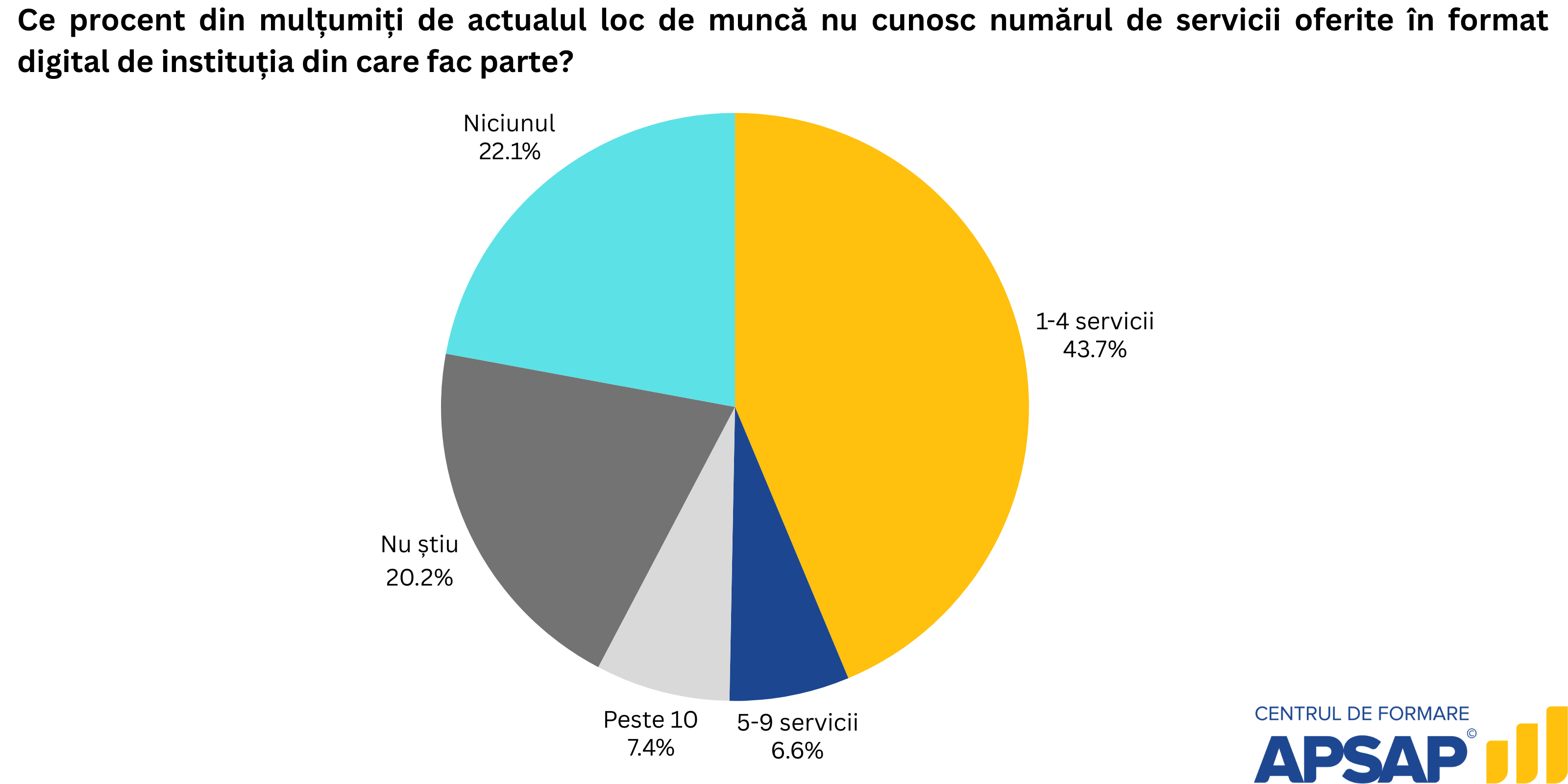 „A manifesta satisfacție față de un anumit lucru implică familiarizarea și înțelegerea detaliilor asociate acestuia. Este interesant faptul că peste 20% dintre cei care se declară mulțumiți de actualul loc de muncă nu cunosc numărul de servicii oferite în format digital publicului, de către instituția din care fac parte. Această lipsă de cunoaștere poate reflecta o lacună în comunicarea internă, dar și o lipsă a atenției în furnizarea informațiilor relevante către angajați”, explică Aylin-Alexia David, specialist Centrul de Formare APSAP.