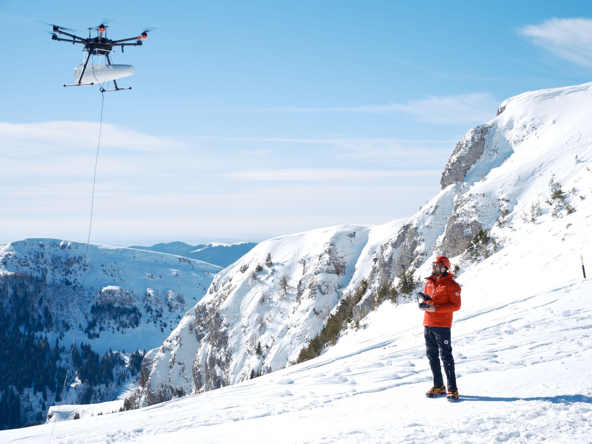 Prima dintre soluții este dezvoltată în premieră de echipa de tehnologie a Vodafone România și asigură acoperirea cu semnal mobil în zonele montane greu accesibile şi înconjurate de pereţi stâncoşi care blochează propagarea semnalului mobil generat de releele terestre actuale. Soluția este formată dintr-un echipament instalat la sol, pe un mijloc de transport specific acestor zone, care se conectează prin satelit la centrul rețelei Vodafone, şi un echipament radio instalat pe o dronă profesională ce este ridicată deasupra zonelor de căutare.