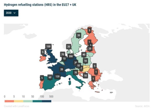„Pentru a garanta că numărul necesar de stații de alimentare cu hidrogen este disponibil până în 2025 și 2030 în întreaga UE ar trebui stabilite obiective obligatorii pentru fiecare stat membru”, încheie cei de la ACEA, care au realizat și o hartă cu necesarul de stații de alimentare cu hidrogen din fiecare stat.
