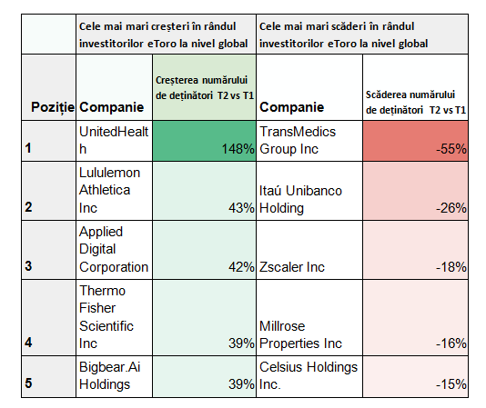 eToro a analizat care sunt companiile care au înregistrat cea mai mare schimbare proporțională a numărului de deținători de la un trimestru la altul (tabelul 1), dar și care sunt cele mai deținute 10 acțiuni de pe platformă (tabelele 2 și 3), la nivel global și în România.