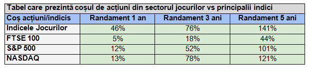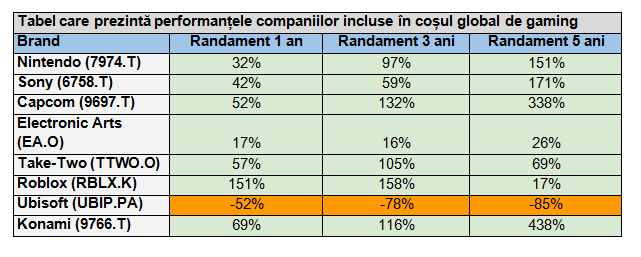 eToro a creat un coș cu opt nume importante din industria jocurilor, de la Nintendo și Sony, la Capcom, Electronic Arts, Take-Two Interactive, Roblox, Ubisoft și Konami, evidențiind faptul că grupul respectiv a urcat cu 46% în ultimul an, cu 76% în ultimii trei ani și cu 141% în ultimii cinci ani, depășind cu ușurință randamentul total de 13% al NASDAQ și cel de 5% al FTSE 100 în aceeași perioadă de 12 luni. Tendințele actuale ale sectorului rămân pozitive, performanțele viitoare fiind determinate de condițiile pieței și de evoluția individuală a companiilor.