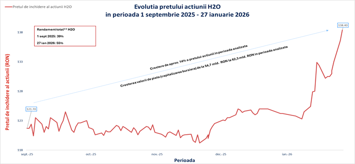 Randamentul acțiunii este calculat prin împărțirea prețului de închidere ajustat, la prețul de listare, respectiv 104 lei. Pretul ajustat este calculat prin cumularea pretului de inchidere al actiunii H2O cu valoarea totala a dividendelor, de 13,99 de lei și de 8,988897 de lei, pentru a reflecta randamentul total, inclusiv dividendele, oferind astfel o imagine a performanței totale a acțiunii pentru investitori, de la listare.
