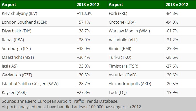 Performanţa aeroporturilor din toată Europa, care au fost tranzitate de mai mult de 100.000 de pasageri în 2012, variază considerabil. Doar două aeroporturi, Kiev Yhulyany şi Londra Southend au înregistrat creşteri mai mari de 50%: 113%, respectiv 57%, potrivit unei analize realizată de publicaţia de specialitate anna.aero.