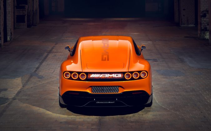 Habitaclul minimalist este dominat de suprafețe negre cu accente argintii și portocalii, elemente structurale la vedere și țevi portocalii iluminate “high-voltage”. Cockpitul purist, cu două ecrane, menține atenția șoferului, iar pernele ergonomice ale scaunelor, printate 3D și acoperite cu piele biotehnologică, oferă confort personalizat. Volanul și comenzile sunt inspirate din hypercar-ul AMG ONE, subliniind ADN-ul de motorsport al mașinii.
