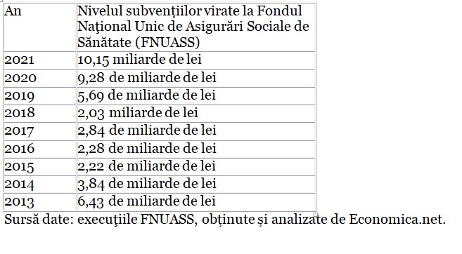 În 2021 Fondul Naţional Unic de Asigurări Sociale de Sănătate a primit cele mai mari subvenţii din 2013 încoace: peste 10 miliarde de lei.