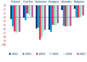 La nivel fiscal, Europa Centrală și de Est continuă să se confrunte cu presiuni semnificative. Majoritatea economiilor din regiune înregistrează deficite bugetare peste pragul de 3% din PIB, iar datoria publică este așteptată să crească în mai multe state, inclusiv Polonia, România și Slovacia. Deși unele guverne au inițiat procese de consolidare fiscală, ritmul acestora rămâne lent, iar vulnerabilitatea la șocuri externe persistă.