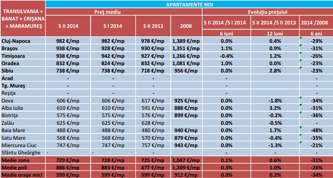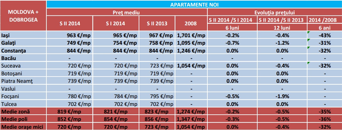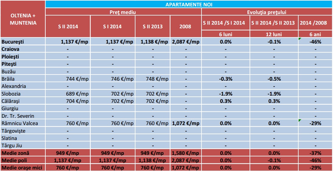 Preţurile la apartamentele noi au scăzut cu 32% de la începutul crizei, iar în ultimele şase luni nu s-au înregistrat variaţii. Astfel, la sfârşitul lui 2014, preţul apartamentelor a ajuns la 776 euro/mp.