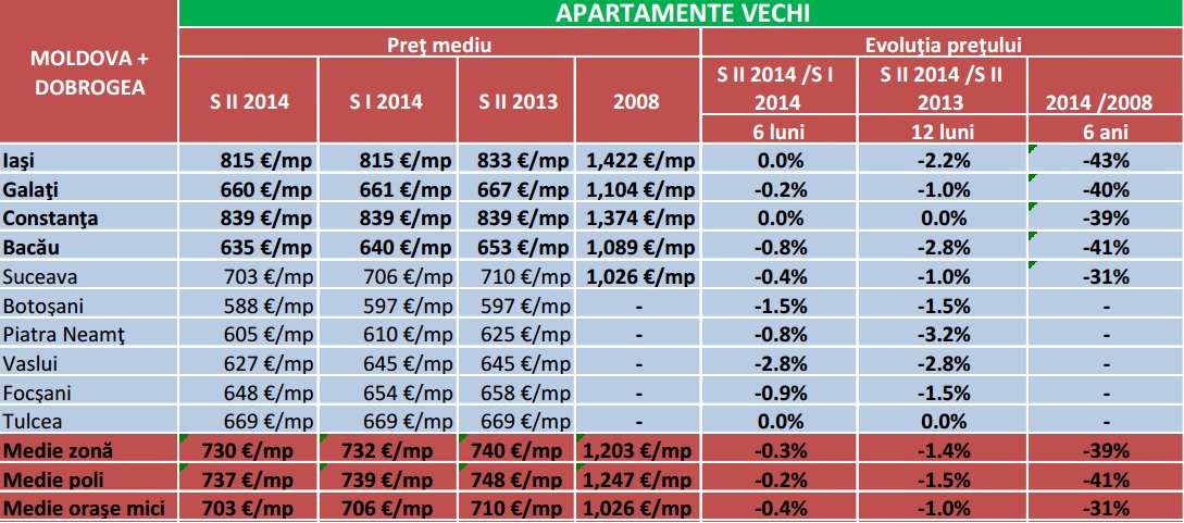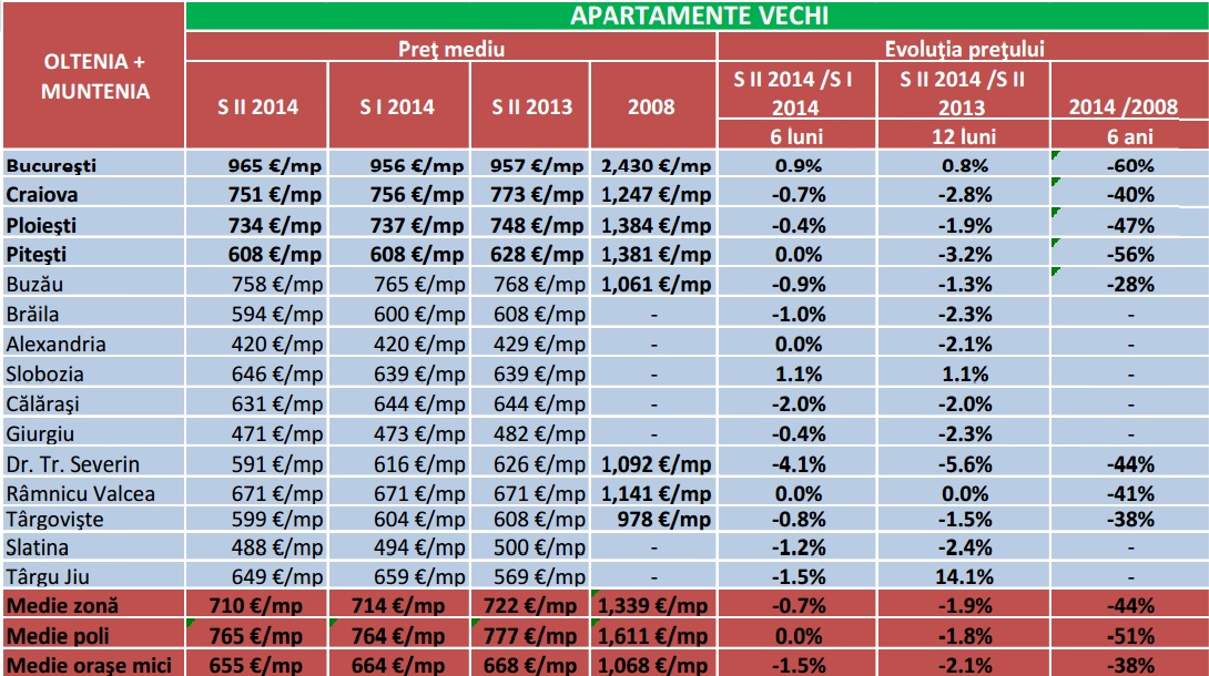 Apartamentele vechi s-au ieftinit în ultimul an cu sub 1%, dar faţă de anul 2008, acestea sunt cu 40% mai mici. Cea mai mare scădere de preţ în ultimele 12 luni, de 5,6%, s-a înregistrat în Drobeta Turnu Severin, unde un metru pătrat costă 591 euro/mp. A doua cea mai mare scădere s-a înregistrat la Arad, de 4,9%, urmat de oraşele Piteşti şi Piatra Neamţ, cu o scădere de 3,2%. Cu 2,8% s-au ieftinit apartamentele din Bacău, Craiova şi Vaslui.