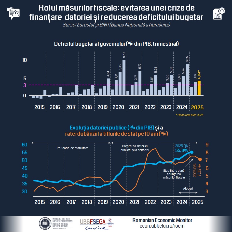 În țara noastră, semnele riscului unei crize de finanțare a datoriei publice au devenit tot mai clare pe parcursul anului 2024. După ce dobânda titlurilor de stat pe termen lung (10 ani) a crescut de la 3%, în 2021, la 7%, în octombrie 2024, reflectând atât creșterea nesustenabilă a deficitului bugetar, cât și politica monetară mai strictă, acesta a trecut printr-o perioadă de volatilitate ridicată după alegerile electorale de la finalul anului 2024, atingând chiar 8,5%, în timpul alegerilor prezidențiale din 2025. Deși după stabilizarea politică s-a produs o oarecare normalizare, volatilitatea devenind una mai redusă, dobânda se menține în continuare la un nivel ridicat, de peste 7%. Această situație înseamnă că statul se împrumută pe termen lung – fapt esențial din perspectiva investițiilor și a creșterii economice – cu costuri ridicate, iar restabilirea echilibrului bugetar rămâne esențială pentru a avea acces la împrumuturi mai ieftine, arată analiștii RoEM-UBB FSEGA.