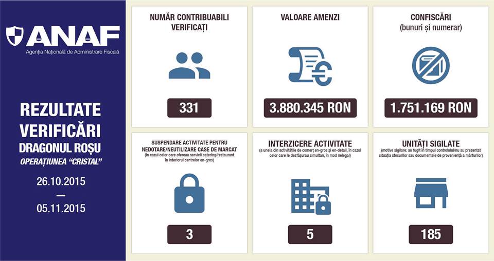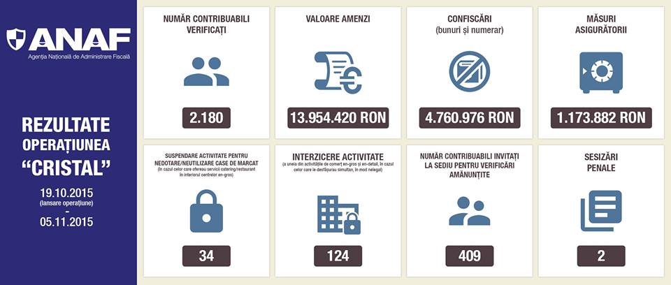 Direcția Antifraudă Fiscală a demarat, luna trecută operațiuniea de control și monitorizare a firmelor care își desfășoară activitatea în toate centrele engros din România, denumită Operațiunea „Cristal”, ce vizează 60 de astfel de locații, prin descinderi simultane în 15 centre din întreaga țară.