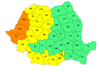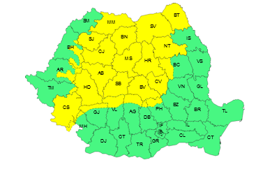 Sunt vizate de atenţionarea Cod galben judeţele Satu Mare, Maramureş, Sălaj, Bistriţa-Năsăud, Cluj, Mureş, Alba, Hunedoara, Sibiu, Caraş-Severin, Mehedinţi, Dolj, Olt, Teleorman, Giurgiu, Ilfov şi Capitala.