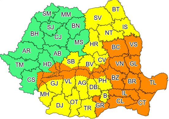 Meteorologii au mai emis o avertizare Cod portocaliu de viscol în judeţele Călăraşi, Ialomiţa, Brăila, Buzău, Tulcea, Constanţa, Vrancea, Galaţi, Vaslui şi Bacău, precum şi în Carpaţii Meridionali şi de Curbură, care va fi în vigoare duminică, între orele 2:00 şi 16:00.