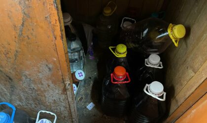 – comercializarea unor produse contrafăcute – vin expuse în sticle tip din plastic cu etichete scrise de mână