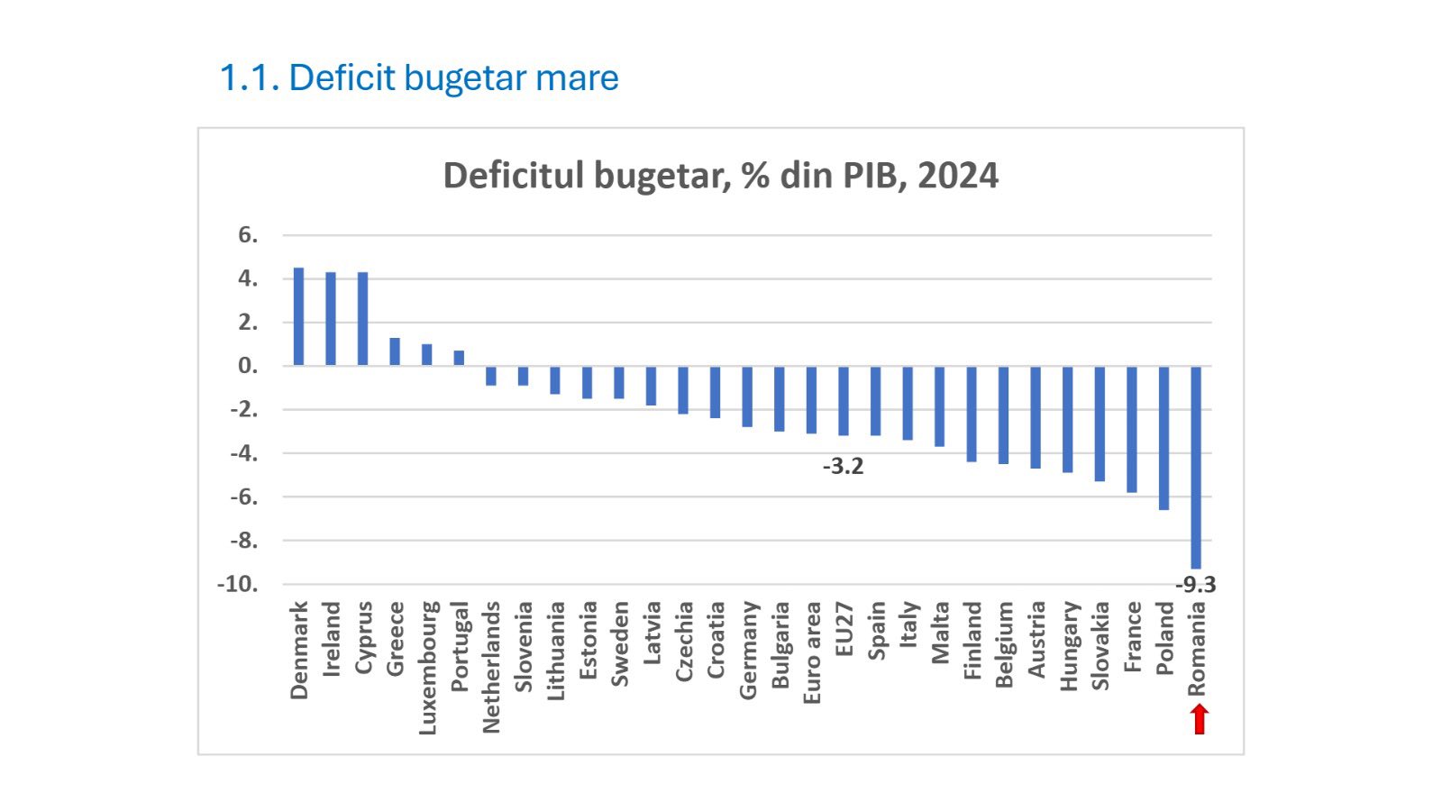 „De mai mulți ani, statul cheltuie mult mai mult decât încasează. Așa am ajuns ca anul trecut să avem cel mai mare deficit bugetar din țările europene, de 9,3% din Produsul Intern Brut al României (graficul alăturat), practic din tot ce se produce in țară. Această cifră nu spune direct cât de mult cheltuim față de veniturile pe care le încasăm din impozite și taxe. De exemplu, anul trecut am încasat 575 de miliarde lei și am cheltuit 727 de miliarde, cu 152 de miliarde în plus (ultimele coloane din grafic)Ț, a scris Boljan pe pagina sa de Facebook.