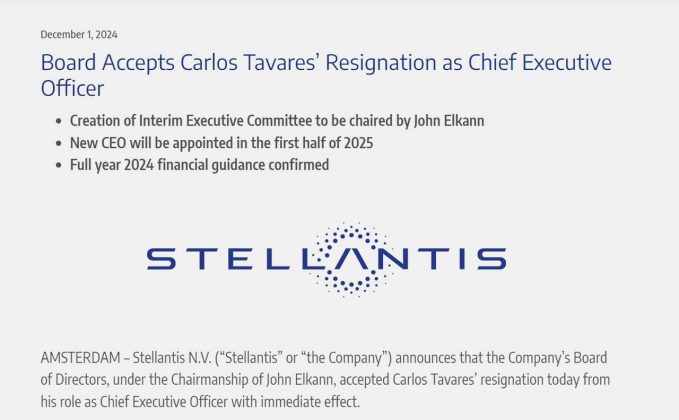 Conform anunțului făcut de Stellantis, „Consiliul de Administrație al Societății, sub președinția lui John Elkann, a acceptat astăzi demisia lui Carlos Tavares din funcția de director executiv (CEO), cu efect imediat”.