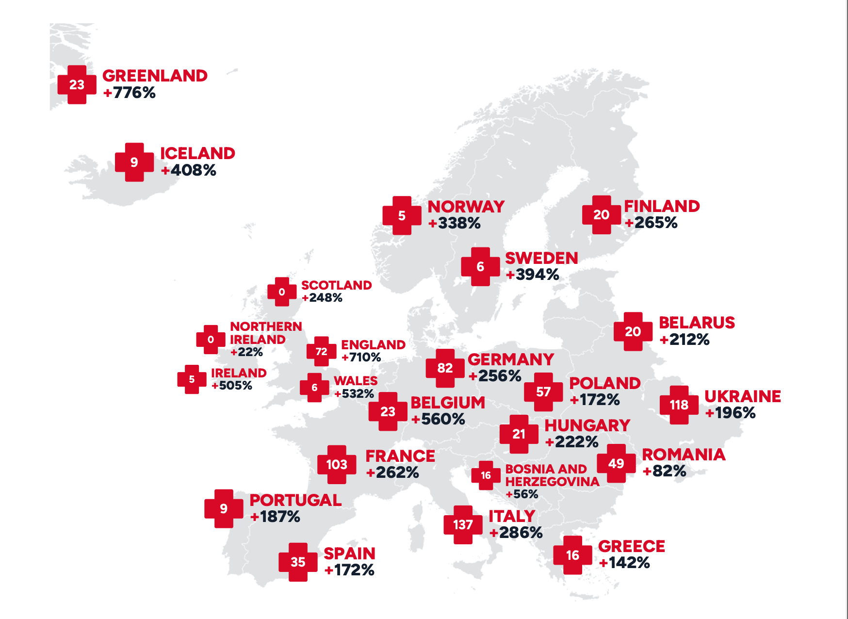 Analiza sugerează că încălzirea globală a dus deja la o creștere cu 27% a riscului de deteriorare a infrastructurii spitalicești din Europa începând cu 1990. Datele arată că Grecia a înregistrat cea mai mare creștere a riscului de deteriorare a infrastructurii spitalicești ca urmare a schimbărilor climatice din Europa până în prezent, cu o creștere de 83% a riscului de deteriorare din 1990. Urmează Anglia, Groenlanda și Islanda.