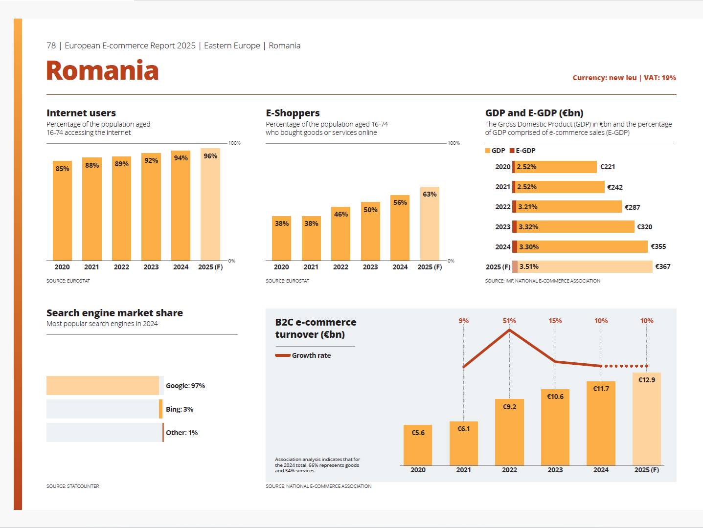 European E-Commerce Report 2025 este realizat de Ecommerce Europe și EuroCommerce, pe baza contribuțiilor a peste 25 de asociații naționale de e-commerce, inclusiv ARMO. Mai multe detalii din studiu vor fi prezentate de ARMO cu ocazia Zilei Comerțului Electronic, pe 15 octombrie 2025.