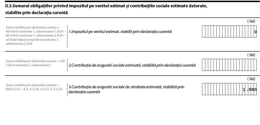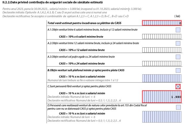 Bifaţi litera C – sunt persoană fără venituri și optez pentru plata CASS şi scrieţi în căsuţă valoarea de 1.980 de lei.