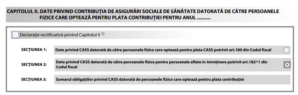 La acest capitol veţi completa doar secţiunea 2 – date privind CASS datorată de către persoanele fizice pentru persoanele aflate în întreținere potrivit articolului 182^1 din Codul fiscal.