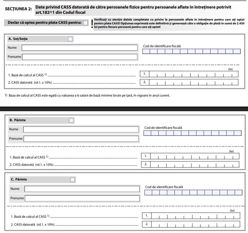 Aici veţi bifa secţiunea 2 – date privind CASS datorată de către persoanele fizice pentru persoanele aflate în întreținere potrivit articolului 182^1 din Codul fiscal.