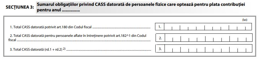 Mergeţi la capitolul II al formularului – date privind contribuţia de asigurări sociale de sănătate (CASS) datorată de către persoanele fizice care optează pentru plata contribuţiei pentru anul. Veţi scrie 2026 în dreptul anului.