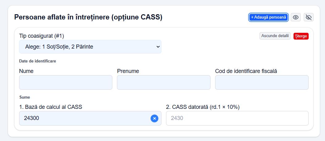 În mod similar celui explicat deja mai sus, veţi completa datele de identificare ale persoanei cu venituri fiscalizate care va plăti CASS pentru persoana sau persoanele aflate în întreţinerea sa.