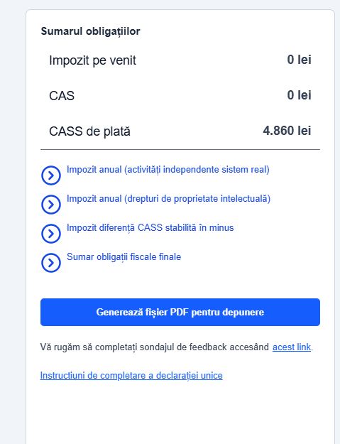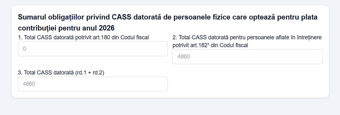 După ce aţi adăugat toate persoanele pe care aţi ales să le asiguraţi la sănătate, vi se va afişa în pagina interactivă „sumarul obligațiilor privind CASS datorată de persoanele fizice care optează pentru plata contribuției pentru anul 2026”. Cu titlu de exemplu, am completat declaraţia unică ca să asigur la sănătate două persoane şi mi s-a generat automat la total CASS datorată pentru cele persoane suma de 4.860 de lei (2.430 de lei CASS – pentru fiecare dintre ele).