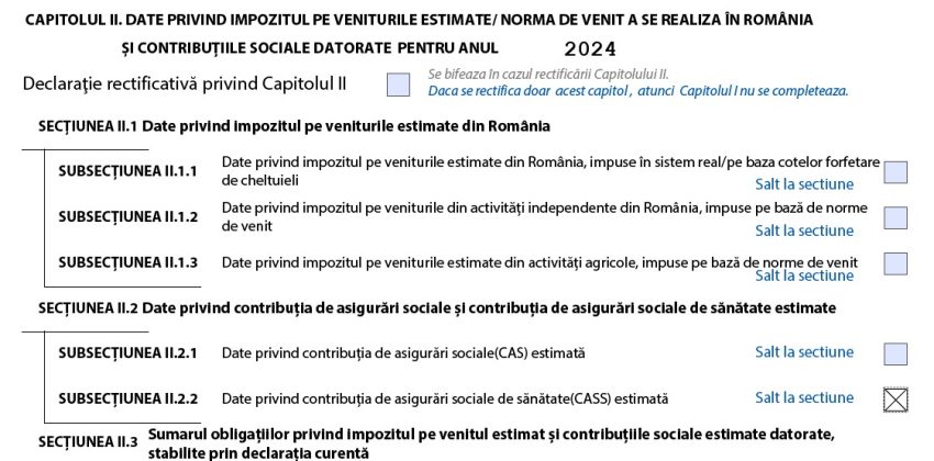 Aici bifaţi doar subsecţiunea II.2.2 – date privind contribuţia de asigurări sociale de sănătate (CASS) estimată. Apoi apăsaţi pe butonul „salt la secţiune”.