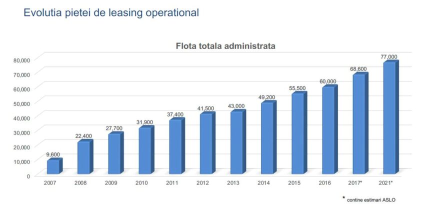Estimările ASLO arată că piața de leasing operațional depășit la finalul anului 2021 nivelul de 77.000 de unități în administrare, ceea ce reprezintă o creștere de peste 8.000 de autovehicule, respectiv 12%, față de finalul anului 2017, ultimul an în care au fost date informații despre aceasta.