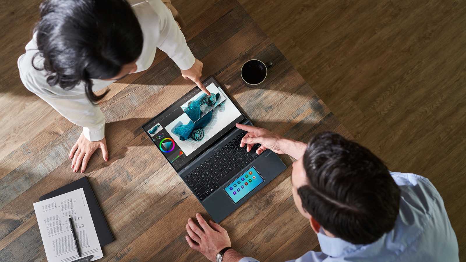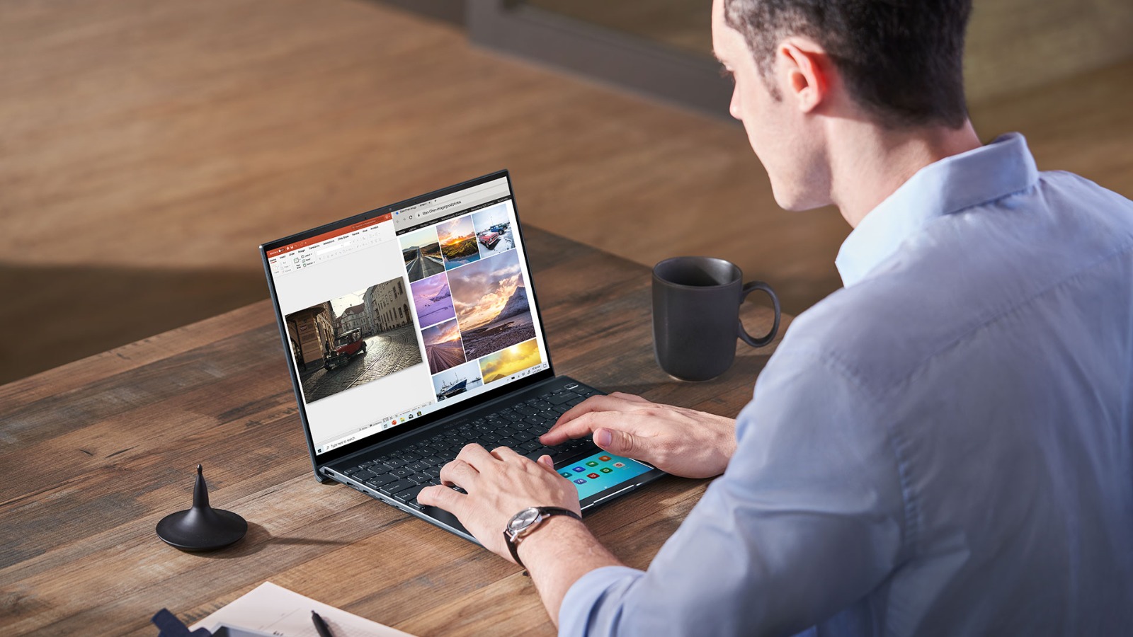Profesioniștii doresc să folosească inovații și tehnologii care sporesc productivitatea, de aceea ASUS a încorporat ScreenPad în touchpad-ul laptopului ASUS Zenbook 14X OLED (UX5400). ScreenPad este un afișaj secundar IPS tactil, de dimensiuni mai mici, măsurând 5.65 inch pe diagonală și având rezoluția de 2160 x 1080 pixeli. Prin simpla apăsare a pictogramei de comutare se poate selecta modul de lucru touchpad, cel care permite controlul cursorului sau modul de lucru ScreenPad, care funcționează prin extinderea spațiului de lucru oferit de afișajul principal.