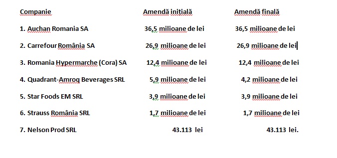 În cazul furnizorilor Star Foods EM și Strauss România, ICCJ a menținut deciziile de sancționare, iar în cazul Quadrant Amroq Beverages SRL, a confirmat încălcarea legii concurenței, dar a redus amenda la 4,2 milioane lei, de la 5,9 milioane lei. Referitor la Nelson Prod, Curtea de Apel București a menținut decizia autorității de concurență, iar compania nu a făcut recurs.