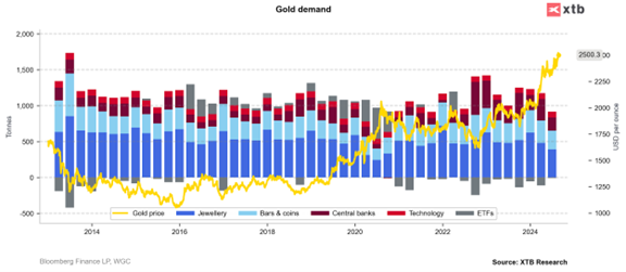 Evaluând datele din al doilea trimestru al anului 2024, analiștii XTB, companie specializată în tranzacționarea pe piețele internaționale, remarcă o reducere semnificativă a cererii. Cererea pentru bijuterii a atins cel mai scăzut nivel din 2020, iar cererea totală este cea mai redusă din 2021.