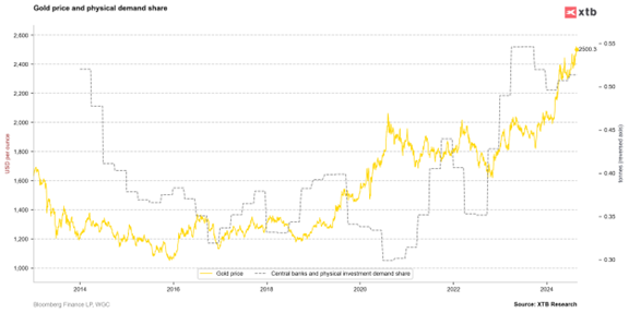 Cu toate acestea, se poate observa o relație istorică – investitorii cumpără unități ETF pe aur atunci când ratele dobânzilor sunt reduse, iar acest moment va veni foarte curând. Dacă ETF-urile ar reveni la cantitatea record de aur deținută, adică aproximativ 110 milioane de uncii, de la cele 82 de milioane de uncii actuale, ar însemna că cererea pe piață ar fi în jur de 800 de tone. Acest lucru ar putea inversa în mod clar situația recentă de surplus de ofertă, subliniază analiștii XTB.
