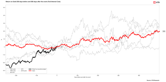 Analiza comportamentului aurului înainte și după prima reducere a ratei dobânzii de către Fed din ultimii 40 de ani indică o creștere medie de aproximativ 20% în decurs de doi ani după reducere. În majoritatea cazurilor, aurul a înregistrat creșteri semnificative, iar doar într-un singur caz a avut o scădere, însă aceasta nu a depășit 10%.