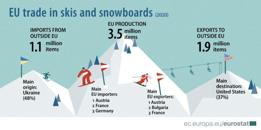 În rândul statelor membre, cei mai mari exportatori de schiuri şi snowboarduri au fost Austria (2,1 milioane), Bulgaria (564.700) şi Franţa (551.200).
