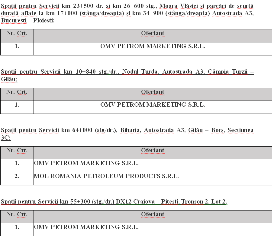 OMV PETROM MARKETING S.R.L. a depus oferte pentru concesionarea celor 8 spații de servicii și 4 parcări de scurtă durată situate pe:
