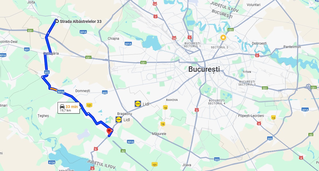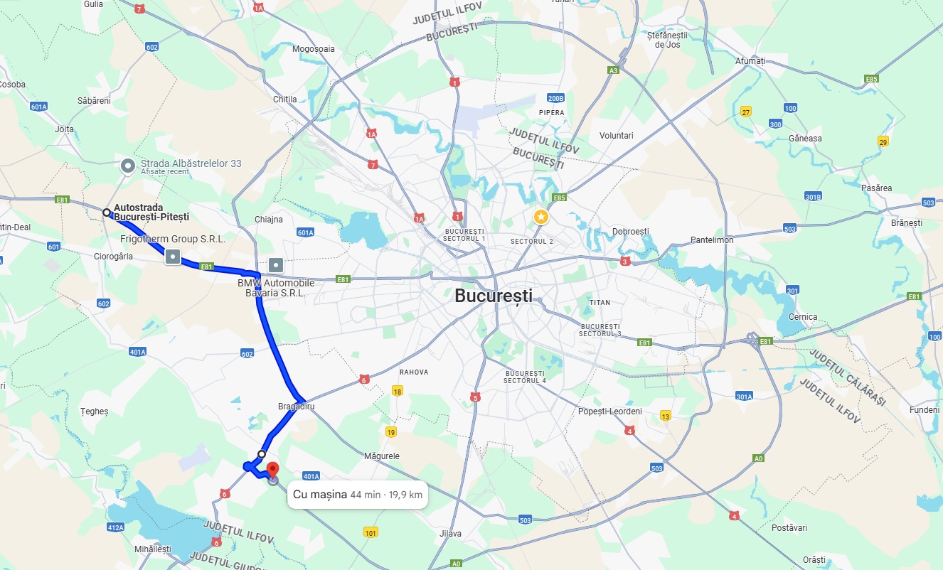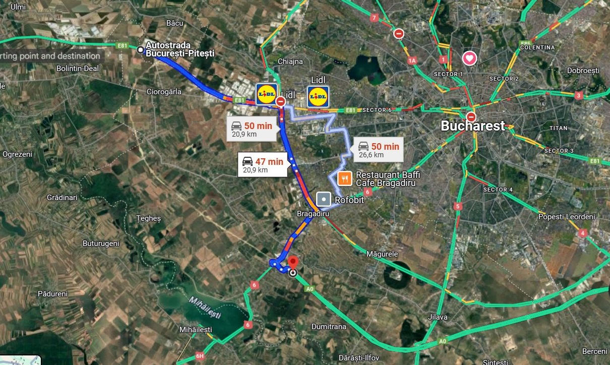 Tot pe Google Maps, se observă că pe traseul analizat mai este indicată și varianta utilizării unui drum județean, caz în care este estimată o durată de peste 30 de minute.