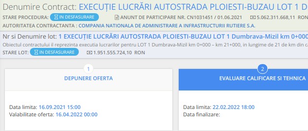 „În legătură cu procesul de evaluare a ofertelor depuse în cadrul procedurii de atribuire a contractelor Execuție lucrări autostrada Ploiești-Buzău, lot 1 Dumbrava-Mizil (km 0+000 – km 21+000), Lot 2 Mizil-Pietroasele (km 21+000 – km 49+350), Lot 3 Pietroasele – Municipiul Buzău (km 49+350 – km 63+250), precizăm că deschiderea celor 39 de oferte depuse s-a realizat în data de 16.09.2021.