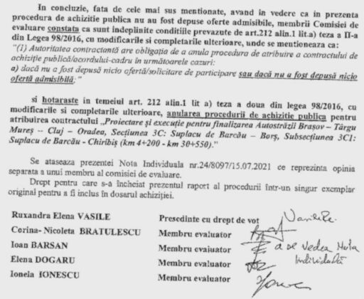 Documentul publicat pe forumul PeUndeMerg al API (foto jos) arată că un membru al comisiei de evaluare a avut totuși opinie separată. Decizia de anulare a licitației poate fi contestată.