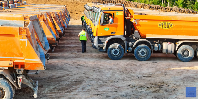 „Aproape bine nu e de ajuns, trebuie să fie perfect la linie”, scrie autorul imaginilor în care se văd zeci de camioane ale constructorului român, aliniate pe mai multe rânduri.