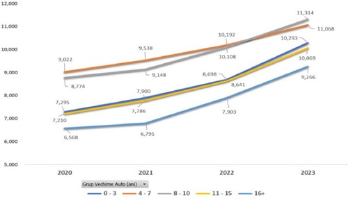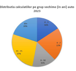 Analiza distribuției calculațiilor pe ani de vechime a autovehiculelor relevă faptul că circa 50% din autovehiculele cu dosare de daună în 2023, aveau o vechime mai mare de zece ani, ponderea cea mai mare fiind a autovehiculelor cu vechime cuprinsă între 11-15 ani. Astfel pentru vehiculele cu o vechime cuprinsă între zero și trei ani, ponderea ponderea dosarelor de daune a fost de 16%, pentru cele cu vechimea cuprinsă între patru și șapte ani ponderea a fost de 22%, pentru mașinile cu vechimea între opt și zece ani ponderea a fost de 15%, pentru cele cu vechimea cuprinsă între 11 și 15 ani ponderea a fost de 27% și pentru cele mai vechi de 16 ani ponderea a fost de 20%.