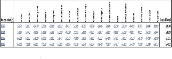 Nu în ultimul rând, analiza BAAR a scos în evidență evoluția costului mediu total al pieselor înlocuite în devizele de raparații, în perioada 2020 – 2023 și județele cu cele mai mari cifre înregistrate. Astfel, costul mediu total al pieselor de schimb a crescut de la 4.830 de lei în anul 2020, până la 6.492 de lei, trei ani mai târziu, conform tabelului de mai jos: