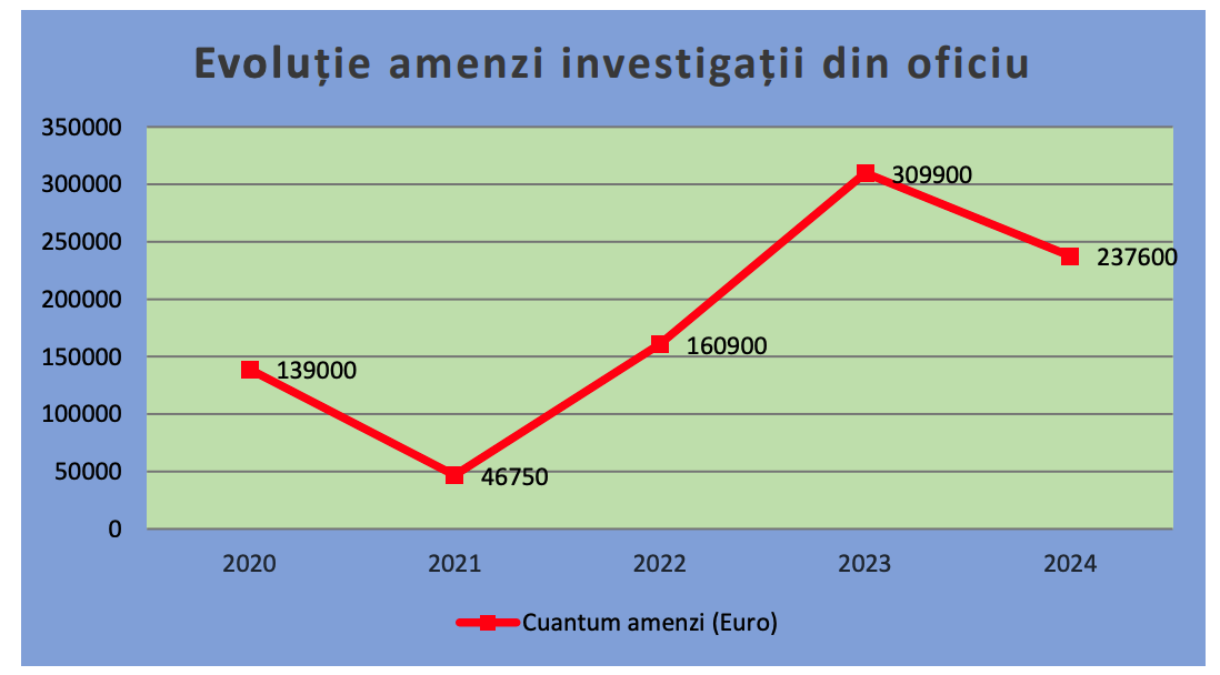 În total, în perioada 2021-2024, instituția a reușit să aplice amenzi din investigațiile din oficiu cu valoare totală de 755.150 de euro.