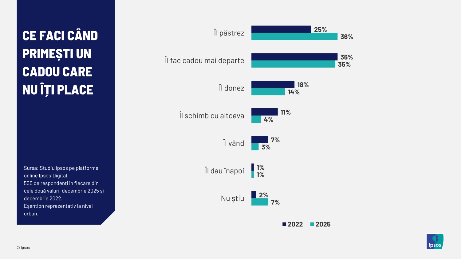 Anul acesta, păstrarea cadoului este la egalitate cu oferirea cadoului mai departe, care a trecut pe locul secund cu 35%. Celelalte opțiuni sunt în scădere față de 2022: intenția de a schimba produsul a coborât semnificativ la 4% (față de 11%), donarea acestuia a scăzut la 14% (de la 18%), iar vânzarea cadourilor considerate nepotrivite este preferată de doar 3% dintre persoane (comparativ cu 7%).
