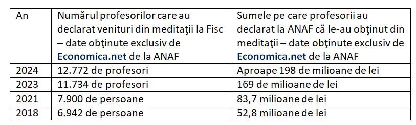 Aproape 13.000 de profesori din ţara noastră au declarat la Fisc faptul că au obţinut venituri din meditaţii în anul 2024, a căror valoare netă cumulată se apropie de 198 de milioane de lei, arată datele obţinute în exclusivitate de Economica.net de la ANAF. Cele mai venituri din meditaţii au fost declarate de profesorii din Capitală şi Ilfov – aproape 60 de milioane de lei în 2024, din judeţul Cluj – peste 19 milioane de lei, din judeţul Braşov – 9,7 milioane de lei. Suma netă din meditaţii pe care profesorii au declarat la Fisc că au obţinut-o în anul 2024 e de cel puţin trei ori mai mare decât cea aferentă anului 2018, primul an pentru care contribuabilii au depus declaraţia unică, formularul prin care declară şi profesorii la Fisc aceste venituri, conform analizei Economica.net bazate pe datele obţinute de la ANAF.